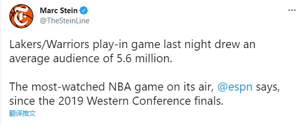 24直播网讯 北京时间5月21日,湖人和勇士全美直播收视率出炉,据名记Marc Stein报道,湖人对阵勇士附加赛的平均收视人数为560万人,此数字为19年西决之后最高平均收视,这也是本赛季平均收视最高的一场比赛,詹姆斯和库里两大巨星保证了收视率。