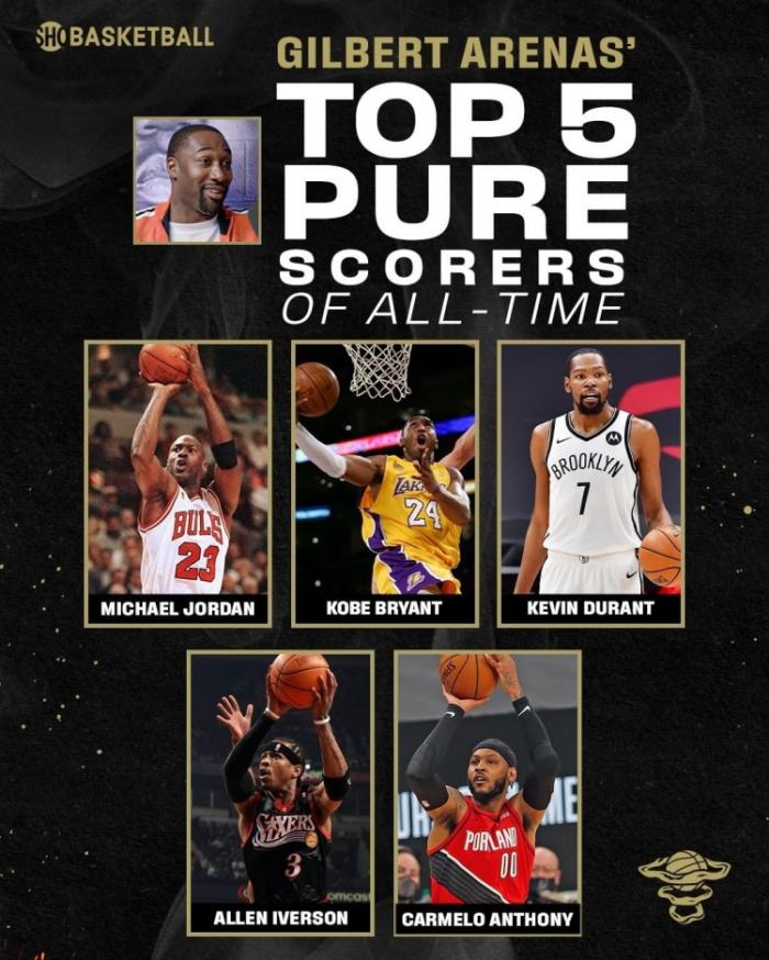 阿里纳斯也是昔日的全明星球员,顶级双能卫,能在与湖人对飙中轰下60分的男人,能在他的心中被称为顶级得分手的都不是泛泛之辈!而这里谈到的纯得分手,不仅要考虑到他们的场均得分、单场得分表现,还要综合他们的得分技巧以及全面性!