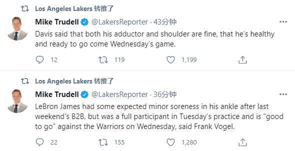 湖人官方转发关于詹姆斯和浓眉的伤情报告。