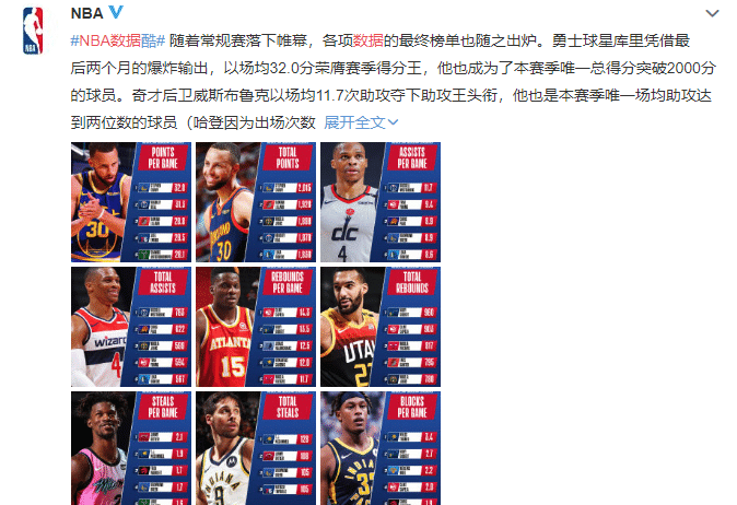 从数据对比就可以看出来,七大数据王全部易主,这其中哈登和詹姆斯无缘数据王,这点和伤病是有直接关系的,詹姆斯一度表现强势,哪怕是单核带队也稳居前四,是MVP的热门候选。但可惜的是对阵老鹰受伤,之后长期缺阵、复出之后状态也相对一般,所以詹姆斯本赛季的常规赛之旅并不平坦,数据王自然没有斩获。