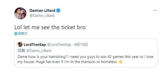 在获胜兑现承诺后,利拉德也是在社交媒体上@了特雷萨,调侃:现在让我看看你的票根吧,兄弟。相比胜利,很多球迷更加关心押上房子的特雷萨能够赚到多少钱。