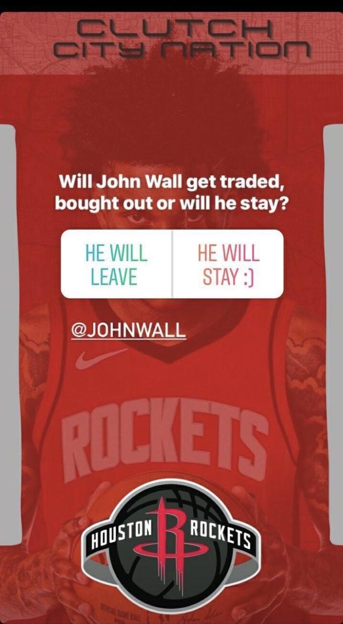 5月15日,一家名叫Clutch City Nation的火箭媒体发起了一项投票。投票内容是:沃尔会被交易,买断还是会留下?在投票的选项中,该媒体给出了沃尔会留下还是会离开两个选择?