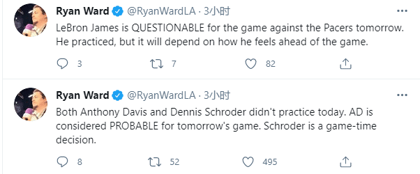 24直播网讯 北京时间5月15日,湖人下一场对阵步行者的伤情报告出炉,据名记报道Ryan Ward报道,浓眉和施罗德都没有参加今天的训练,浓眉大概率出战,施罗德已经解除隔离,将在赛前决定是否复出;詹姆斯参加了训练,但他被列为出战成疑,是否复出取决于他的热身感觉。