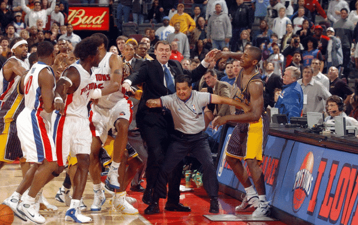 被泼啤酒后,慈世平迅速冲上看台,他的目标就是约翰,慈世平认为这事是约翰干的,还在看热闹的约翰被慈世平摁住猛揍了几拳,不过约翰和他的朋友也不是好惹的,两人开始迅速反击,不过两个普通人想和NBA球员打架显然是不够的,所幸的是在活塞其他球迷的帮助下,这两人才被拖出这场闹剧。