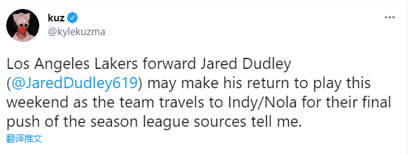 库兹马兼职记者,发推爆料:联盟多名消息人士透露,洛杉矶湖人前锋杜德利可能会在本周末迎来复出,届时球队将迎来与步行者和鹈鹕的比赛,进行本赛季的最后冲刺。