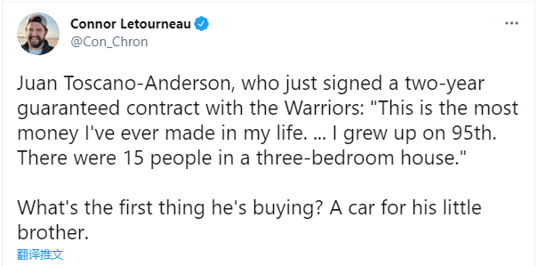 勇士记者还透露,安德森签下合同后可以为家人做很多事情,要买的第一件东西是什么?给他的小弟弟买一辆车。