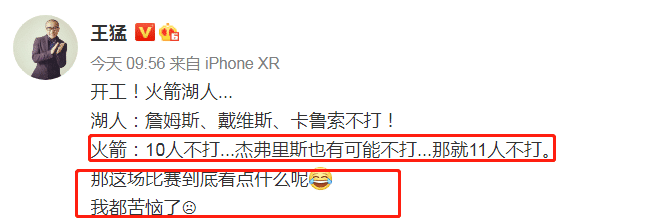 “湖人的詹姆斯,戴维斯,卡鲁索不打,火箭10人不打,杰弗里斯也有可能不打,那这场比赛到底看点是什么呢,我都苦恼了”。
