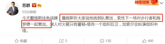 苏群老师则点评了詹姆斯缺席今天比赛的事情,在他看来,老詹是要和施罗德一起复出了。据悉,下一场比赛,施罗德很可能出战,而詹姆斯也可能复出。
