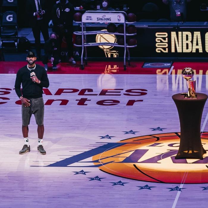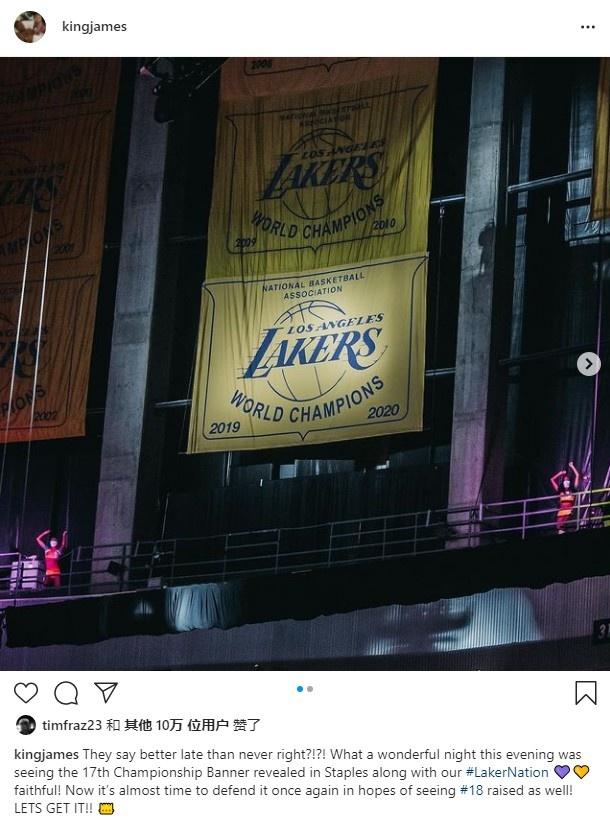 比赛之后老詹更新了社媒,很快就有了10万个人进行点赞,内容“他们说,迟到总比不到好,对吧?!?!今晚是多么美妙的一个夜晚,与我们湖人国度忠实的球迷们一起,看到这第17面冠军旗在斯台普斯升起。现在,是时候再一次去捍卫它了,希望看见第18面旗帜也能被升起来!让我们去拿下它!”