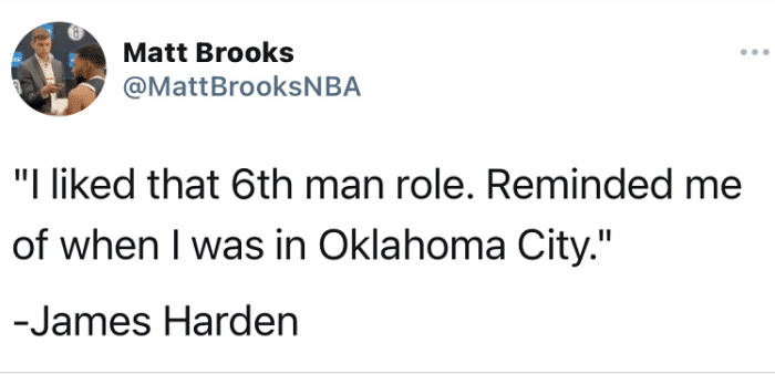 谈及自己替补的身份,时隔9年又一次替补,哈登体现高情商:“我喜欢这种第六人的角色,从板凳上站起来帮助球队。这让我回忆起了早年在俄城的岁月。”