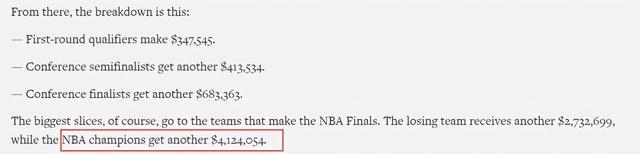 众所皆知,NBA球员合同只包含常规赛,所以季后赛球员是没有薪水的,不过征战季后赛的球员还是能够拿到一笔奖金,这笔钱来自于NBA的季后赛奖金池。