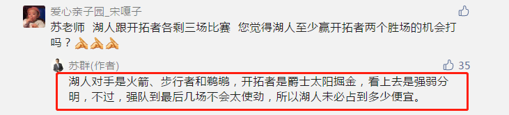 而苏群认为,“看上去湖人和开拓者的对手强弱分明,不过,强队到最后几场不会太用劲,所以湖人未必能占到便宜”。可以看出,苏群老师还是不看好湖人能超开拓者,三强爵士,太阳和掘金,可能会放水,而开拓者显然会是更被看好直接进入季后赛的球队。