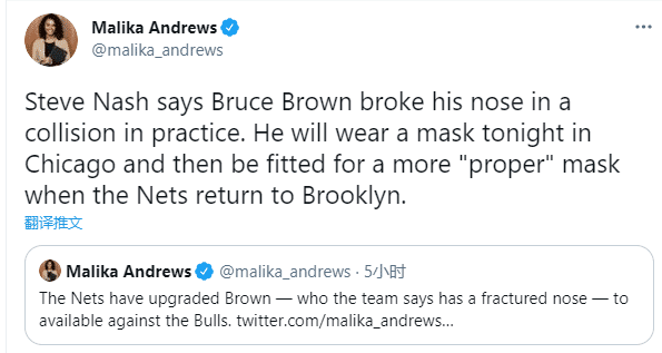 篮网悍将布鲁斯-布朗在训练中撞伤鼻子,确诊为鼻子骨折,但他将会带伤出战,将会戴着面具出战,等回到布鲁克林,篮网将会为他选择更合适的面具;对此纳什盛赞布朗是一位硬汉。