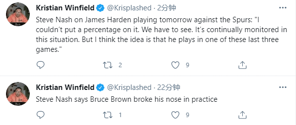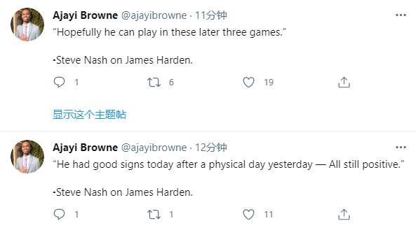篮网主帅纳什表示,经过昨天的高强度训练之后,哈登今天的感觉良好,一切都很乐观,他希望哈登能在常规赛最后三场比赛中复出;纳什强调哈登在季后赛之前复出很重要,可以让哈登再次获得打比赛的感觉。