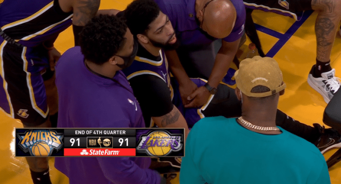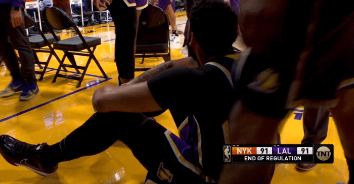 末节结束时,浓眉坐在地板上,詹姆斯等队友都围过来,当时湖人队医就为他按摩治疗;浓眉带伤打完加时赛。