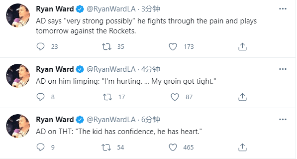 腹股沟有些紧张,不过浓眉表示自己很可能出战背靠背,这暗示他的伤势应该无大碍;对于浓眉的腹股沟伤势,沃格尔表示队医检查了他的情况,并允许他留在球场上,湖人将会在明天评估浓眉的伤势。
