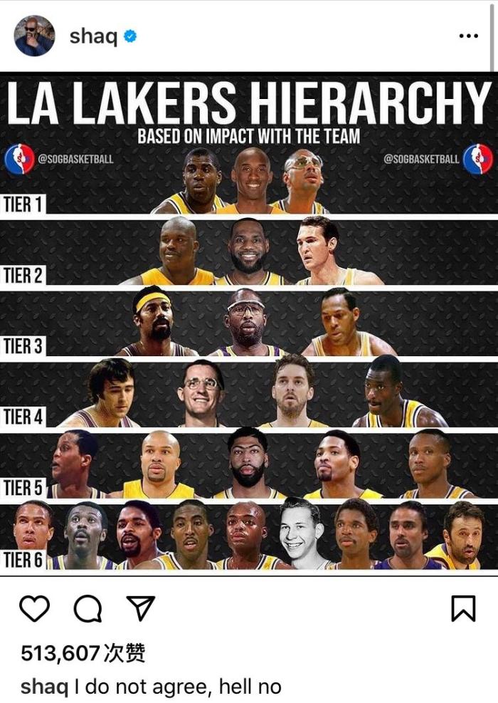 24直播网讯 北京时间5月9日,前湖人名宿奥尼尔在社媒上晒出了一张由媒体制作的湖人队史球员分档图,分档基于他们的荣誉、带队能力、影响力等多个因素,奥尼尔附文“我不同意,绝不。”