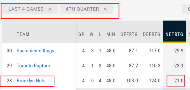 数据显示,四连败期间,篮网的第四节进攻效率103.0,防守效率124.0,百回合输给对手21分,第四节的百回合输分在同期30队中排名第28位,只优于国王和猛龙。
