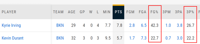 到了关键的第四节,球队一般都是主要依靠球星的进攻,篮网第四节表现不佳,和杜兰特、欧文在末节状态下滑有直接联系。四连败期间,欧文第四节场均得分7.8分,投篮命中率42.3%,三分命中率26.7%。杜兰特下降得更夸张,四连败他打了其中三场,第四节场均5.7分,投篮命中率22.7%,三分命中率22.2%,很难相信这竟然是杜兰特的第四节命中率。