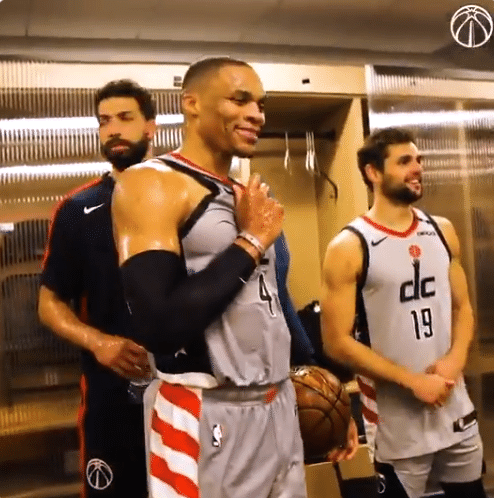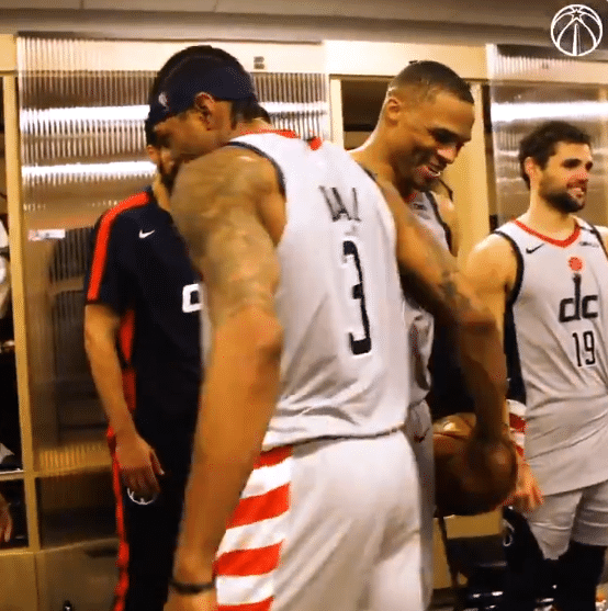24直播网讯 北京时间5月9日,奇才加时险胜步行者,比尔带伤轰下50分,因脚伤伤势提前退赛,韦少狂砍33分19篮板15助攻大号三双,加时赛关键时刻,终场前1秒罚球准绝杀,然后死亡封盖终结比赛;赢球后韦少抱球疯狂庆祝,赛后比尔疯狂庆祝,奇才更衣室庆祝画面也曝光了。