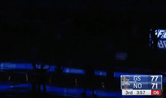 库里这场比赛的分水岭,就是第三节中后端鹈鹕主场停电的那一刻。当时第三节还剩4分钟左右,库里右侧45度绕出接球。此前一个回合,库里刚刚在这里命中一记三分球。结果,库里刚刚接到球,现场突然暗了下来,现场一片哗然。1秒之后,现场灯光重新打开。但显然,比赛需要重新开始。