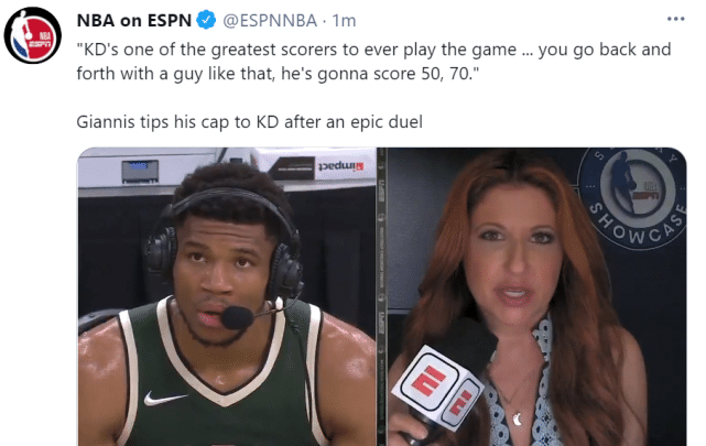赛后,字母哥接受了知名主持人瑞秋-尼科尔斯的采访。在采访中,他猛夸对手杜兰特:“KD是这项运动史上最伟大的得分手之一……你和这样的球员交锋,他可以得到50分,70分!”