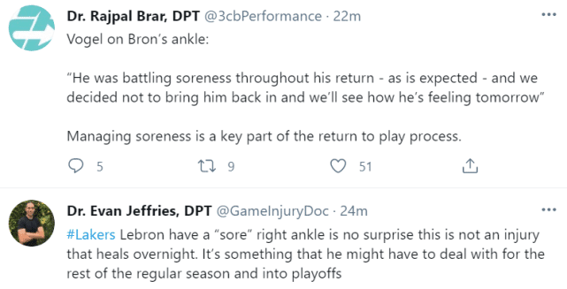 两位医学专家也对詹姆斯的脚踝酸痛进行了解读。医学专家Rajpal Brar表示:“处理脚踝的酸痛问题,是回归打球的一个重要部分。”另一位医学专家Evan Jeffries表示:“詹姆斯出现脚踝酸痛的状况,并不令人意外。因为这种伤病很难快速痊愈。它可能会在余下的常规赛甚至季后赛里继续困扰詹姆斯。”