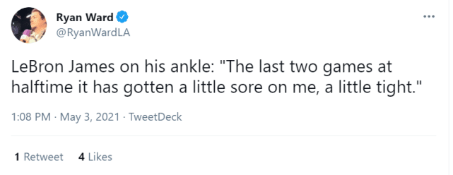 詹姆斯本人在接受采访时,表示:“过去两场比赛的半场时,脚踝都有点酸痛,感觉有点紧。”