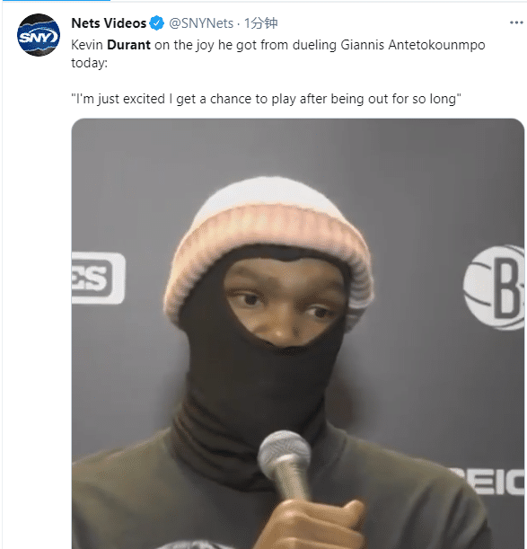 24直播网讯北京时间5月3日,篮网惜败雄鹿,字母哥轰下49分8篮板4助攻3盖帽,杜兰特则是砍下42分10篮板,两大巨星上演神仙打架,都打出疯狂的表现;虽然杜兰特错失绝平三分球,但他真尽力了;赛后接受采访,杜兰特回应对决字母哥,还表示想念哈登了。