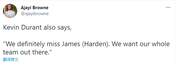 杜兰特还表示想念哈登了,他说:我们确实想念詹姆斯-哈登,我们希望我们全队所有人都能出战。