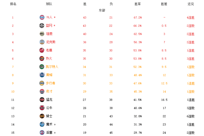 东部1-8名:费城、篮网、雄鹿、尼克斯、老鹰、热火、凯尔特人、黄蜂;