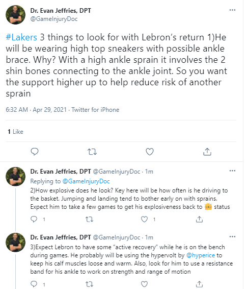 “其三,预计勒布朗在比赛中要接受治疗。他可能会使用一些器材来保持小腿肌肉的松弛和热度,另外他需要用阻力带来提升脚踝的力量和运动范围。”