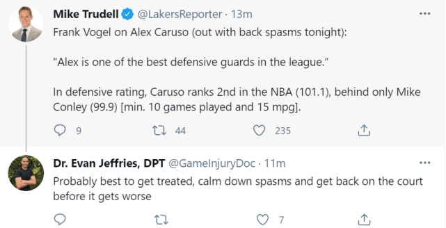 除了詹姆斯、杜德利不能出战,湖人的阵容中又出现了一位新的伤员。卡鲁索在上一场比赛由于背部痉挛伤退,本场比赛他也不会出战。沃格尔把卡鲁索成为联盟最好的防守球员之一,数据也确实如此,在联盟所有至少出场10场比赛且场均至少打15分钟的球员里,卡鲁索的防守效率(101.1),排名联盟第二,仅次于爵士的康利(99.9)。