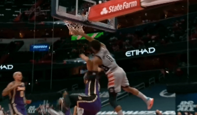 24直播网讯 今天NBA常规赛开始了一场焦点战,奇才主场对阵湖人,这场比赛的经典时刻出现在第三节,八村塁单臂隔扣浓眉哥,相当霸气。