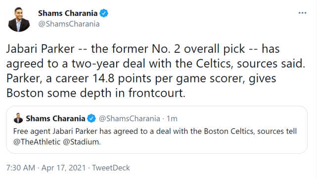 24直播网讯 北京时间4月17日,据名记查拉尼亚报道,自由球员贾巴里-帕克已经同意和凯尔特人签约。消息源透露,这位昔日的榜眼秀,将和绿军签约两年。帕克生涯场均能得到14.8分5.7篮板,他能提升绿军的前场阵容深度。军备竞赛还在继续,五连胜的凯尔特人希望借此提升自己的竞争力,加入总冠军的竞争行列。