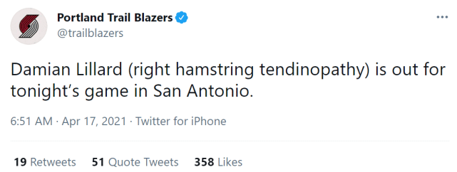 24直播网讯 北京时间4月17日,开拓者官方宣布,达米恩-利拉德缺席客场对马刺的比赛,原因是他的右腿筋出现炎症!又是腿筋伤势,继杜兰特和哈登之后,利拉德成为了又一位腿筋受伤的全明星。除了他们三位,森林狼的马利克-比斯利、国王的霍姆斯也都遭遇了腿筋的伤势而休战。
