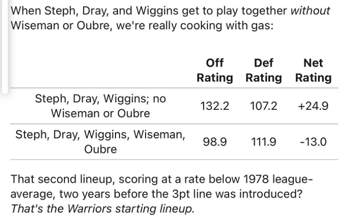 同时还有一项数据,那就是当勇士首发阵容有怀斯曼和乌布雷的时候,他们的进攻效率甚至低于NBA在1978年的联盟平均数据,更加尴尬的是当时的NBA联盟是没有三分线,所以从这点上就也看出勇士队内有怀斯曼和乌布雷的时候进攻效率有多么低下了。