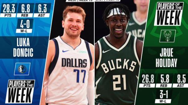 今天早些时候官方宣布东契奇和霍勒迪当选周最佳!前者场均能轰下28.3分6.8篮板6.3助攻,上周率领独行侠取得了4胜0负的战绩,目前独行侠排在西部第七的位置,进入季后赛还不保险,在身后的灰熊、马刺、勇士等球队都虎视眈眈地盯着,常规赛最后阶段会有附加赛,所以最好冲击一下前六!