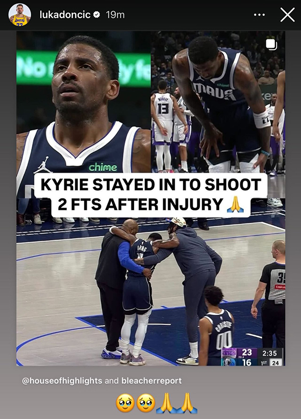 欧文意外受伤牵动无数人的心,NBA多名球星为欧文祈祷,湖人球星詹姆斯发推写道:为凯里祈祷;东契奇转发欧文坚持罚球的画面,也为欧文祈祷;快船球星哈登也发推为欧文祈祷。