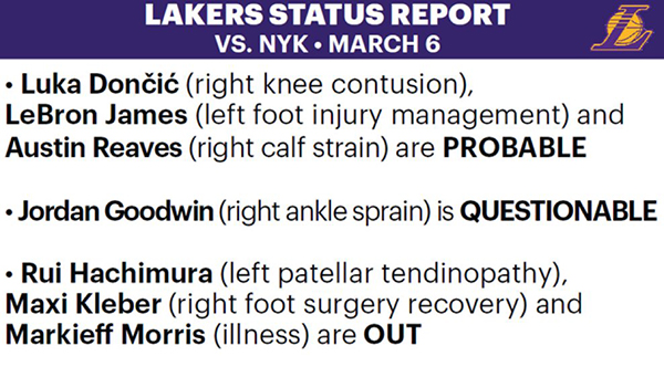 24直播网讯北京时间3月6日,湖人官方公布下一场对阵尼克斯的伤病报告,詹姆斯和东契奇很可能继续出战,里夫斯和古德温有望复出;湖人剑指8连胜,詹姆斯再次冲击里程碑。