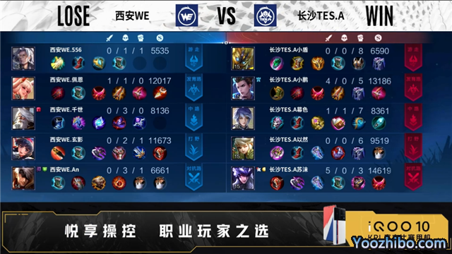 开局中路长沙TES.A三人抢线。1分01秒野区西安WE击杀明世隐,拿下一血,打出0换2。2分31秒河道团战长沙TES.A击杀铠,西安WE打出1换3。3分35秒中路长沙TES.A击杀沈梦溪,拿下暴君,打出1换1。5分08秒长沙TES.A摧毁敌方对抗路外塔,西安WE摧毁敌方发育路外塔。5分41秒长沙TES.A拿下主宰。6分22秒中路长沙TES.A击杀关羽,西安WE摧毁敌方中路外塔。7分23秒西安WE摧毁敌方对抗路外塔,摧毁中路二塔。8分14秒西安WE摧毁敌方对抗路二塔,9分39秒拿下暴君。9分51秒河道团战西安WE击杀不知火舞,打出2换3。11分32秒西安WE拿下暗影暴君,12分13秒拿下暗影主宰。13分05秒对抗路团战长沙TES.A击杀蒙犽,双方打出1换1。15分04秒长沙TES.A摧毁敌方发育路二塔、中路外塔,西安WE拿下暗影暴君。16分43秒西安WE拿下暗影主宰。17分53秒西安WE摧毁敌方发育路二塔,发育路团战打出1换2。19分54秒西安WE摧毁敌方发育路高地,中路击杀夏侯惇。20分41秒西安WE拿下风暴龙王。21分37秒西安WE摧毁敌方中路高地、对抗路高地,打出0换5,团灭对手摧毁水晶拿下比赛。