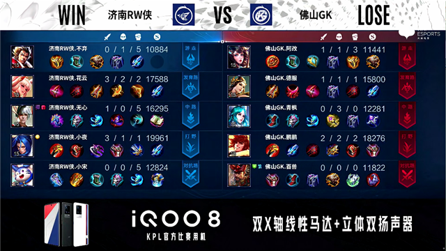 2分11秒,佛山GK控下暴君,济南RW侠控下先知主宰。5分10秒,佛山GK破掉济南RW侠上一塔。6分27秒,济南RW侠控下先知主宰,随后团战佛山GK虞姬击杀橘右京拿下一血。7分10秒,佛山GK控下暴君,随后队伍破掉济南RW侠下一塔。9分40秒,济南RW侠破掉佛山GK下二塔。10分47秒,济南RW侠控下暗影主宰,随后佛山GK控下暗影暴君。11分52秒,济南RW侠强推掉佛山GK中一塔。12分05秒,佛山GK野区击杀公孙离,随后破掉济南RW侠下二塔。13分48秒,佛山GK强破掉济南RW侠上高地。14分36秒,济南RW侠控下暗影主宰。15分53秒,济南RW侠公孙离中路反打击杀裴擒虎。16分42秒,济南RW侠破掉佛山GK中二塔。19分04秒,双方破掉对方下高地。19分31秒,济南RW侠控下暗影主宰。21分05秒,龙王团,佛山GK打出1换2。21分50秒,佛山GK控下风暴龙王,随后破掉济南RW侠中一塔。22分51秒,佛山GK破掉济南RW侠中二塔。24分钟,济南RW侠击杀王昭君,随后再击杀裴擒虎。24分50秒,济南RW侠击杀虞姬并破掉佛山GK中高地。25分08秒,济南RW侠摧毁佛山GK水晶先下一城。