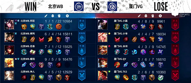 双方和平开局。1分40秒中路团战,镜拿下一血。2分08秒镜拿下暴君,裴擒虎拿下主宰。3分15秒下路团战,镜被击杀,北京WB推掉下路一塔。5分13秒上路团战,北京WB打出0换2。5分30秒中路团战,双方2换2,北京WB推掉中路一塔。6分钟裴擒虎拿下暴君。7分58秒裴擒虎拿下主宰。10分30秒李元芳拿下主宰。11分钟李元芳拿下暴君。11分45秒裴擒虎推掉中路高地塔,团战厦门VG打出1换2。14分10秒高地团战,厦门VG打出1换2。15分钟裴擒虎拿下暴君。15分45秒中路团战,厦门VG打出1换2。18分16秒北京WB中路一塔被破。19分钟中路团战,双方1换1。19分16秒野区团战,厦门VG打出0换2。20分40秒风暴龙王团,关羽被击杀。21分44秒裴擒虎拿下风暴龙王。22分40秒上路团战,厦门VG团灭北京WB。23分47秒马可波罗推掉中路高地塔。25分30秒河道团战,李元芳被击杀。26分40秒镜拿下风暴龙王。28分16秒马可波罗推掉下路高地塔。29分05秒厦门VG推掉水晶追回一分。