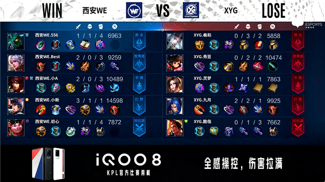 双方常规开局,1分13秒中路团战西安WE击杀东皇太一拿到一血。2分02秒XYG对抗路击杀娜可露露。3分10秒西安WE拿下暴君。3分19秒XYG拿下主宰。4分40秒西安WE摧毁敌方发育路外塔。5分08秒中路团战双方1换1,XYG摧毁敌方中路外塔。5分32秒西安WE野区击杀李元芳。5分39秒西安WE摧毁敌方中路外塔。6分24秒西安WE摧毁敌方对抗路外塔。6分53秒中路团战西安WE击杀橘右京。7分08秒西安WE发育路击杀吕布。7分39秒西安WE拿下暴君。8分35秒西安WE摧毁敌方发育路二塔。8分50秒西安WE百里守约高地击杀李元芳。9分46秒西安WE击杀东皇太一并摧毁发育路高地塔。10分28秒西安WE拿下暗影暴君。11分15秒西安WE拿下暗影主宰。11分59秒高地下XYG击杀墨子。14分35秒西安WE发育路击杀不知火舞。14分46秒西安WE拿下暗影暴君。15分47秒西安WE强点水晶拿下比赛。