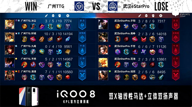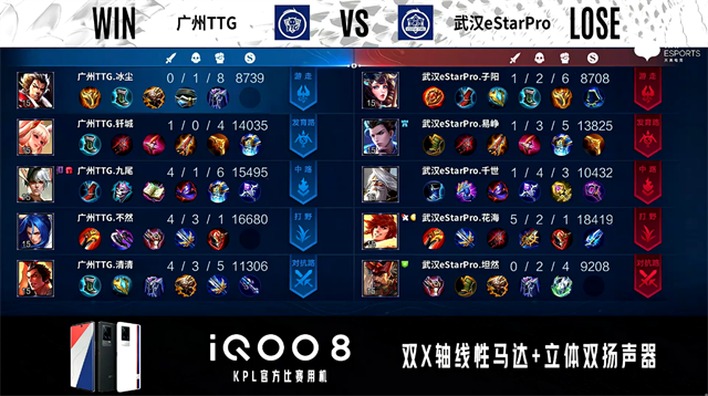 双方常规开局。1分07秒武汉eStar反掉蓝BUFF。1分18秒广州TTG中路击杀兰陵王拿到一血。1分43秒武汉eStar发育路击杀周瑜。2分21秒武汉eStar拿下暴君。3分03秒野区团战广州TTG打出3换4,蒙恬拿到三连决胜。4分50秒武汉eStar野区击杀澜。5分31秒武汉eStar拿下主宰。6分33秒主宰处团战广州TTG打出1换2。7分43秒中路团战广州TTG打出0换2。8分51秒武汉eStar摧毁敌方中路外塔。10分20秒武汉eStar拿下暗影暴君。11分57秒广州TTG野区击杀夏侯惇。13分42秒中路团战广州TTG打出1换2。14分42秒暴君处团战双方3换3。15分10秒广州TTG中路击杀不知火舞。15分57秒广州TTG对抗路打出0换2。16分48秒广州TTG打出1换2。18分07秒中路团战武汉广州TTG打出3换4。18分53秒广州TTG摧毁敌方水晶拿下比赛。
