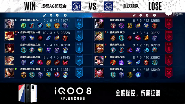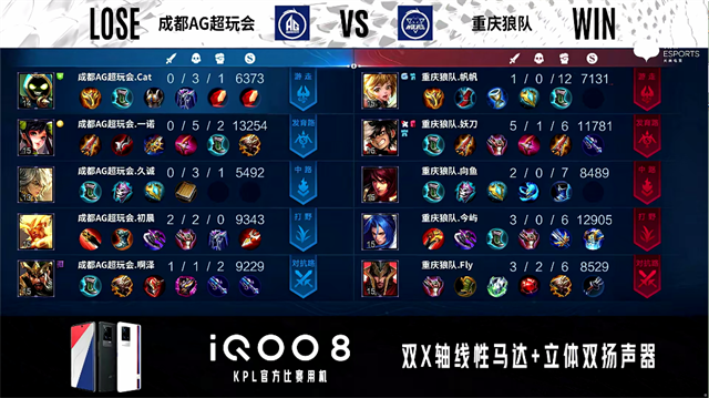 1分24秒,成都AG李元芳下路击杀上官婉儿拿下一血。4分16秒,重庆狼队控下暴君,成都AG控下先知主宰。4分35秒,重庆狼队下路打出0换2。4分58秒,重庆狼队入侵野区击杀橘右京。5分38秒,重庆狼队破掉成都AG下一塔。7分28秒,成都AG破掉重庆狼队上一塔。8分06秒,成都AG橘右京入侵野区拿下双杀。8分32秒,重庆狼队云缨抢到暴君,成都AG李元芳控下先知主宰。10分25秒,重庆狼队破掉成都AG上一塔。10分44秒,成都AG控下暗影暴君。11分03秒,成都AG破掉重庆狼队中一塔。11分51秒,成都AG破掉重庆狼队上二塔。12分10秒,成都AG破掉重庆狼队上高地。12分20秒,成都AG破掉重庆狼队中二塔。12分45秒,成都AG控下暗影主宰。13分30秒,重庆狼队下路击杀梦奇。14分52秒,成都AG破掉重庆狼队下高地。15分20秒,成都AG击杀伽罗,随后控下暗影暴君。16分11秒,成都AG破掉重庆狼队中高地,随后团战成都AG打出4换5。17分55秒,重庆狼队团战打出0换2,随后破掉成都AG中路两座外塔。18分27秒,重庆狼队中路击杀李元芳并破掉重庆狼队中高地。18分51秒,重庆狼队控下暗影主宰。21分50秒,河道团,成都AG打出0换5团灭对手。22分26秒,成都AG一波摧毁重庆狼队水晶扳回一城。