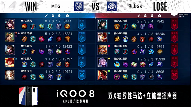 2分18秒,MTG控下先知主宰。3分52秒,佛山GK西施击杀老夫子拿下一血。4分33秒,佛山GK破掉MTG下一塔,随后露娜控下暴君。6分10秒,佛山GK击杀虞姬。7分10秒,双方1换1。8分04秒,佛山GK控下先知主宰。9分50秒,佛山GK破掉MTG中一塔。11分12秒,佛山GK控下暗影主宰,随后MTG控下暗影暴君,双方团战佛山GK打出0换2。14分10秒,佛山GK破掉MTG下二塔。15分16秒,河道团,MTG打出0换2,随后控下暗影主宰。15分44秒,MTG破掉佛山GK中路两座外塔及上、下路二塔。16分47秒,MTG拿下暗影暴君。17分10秒,佛山GK击杀貂蝉。18分50秒,MTG强拆掉佛山GK上高地。19分25秒,双方团,MTG打出1换4,虞姬拿下三杀。19分55秒,MTG中路一波摧毁佛山GK水晶赢下比赛。