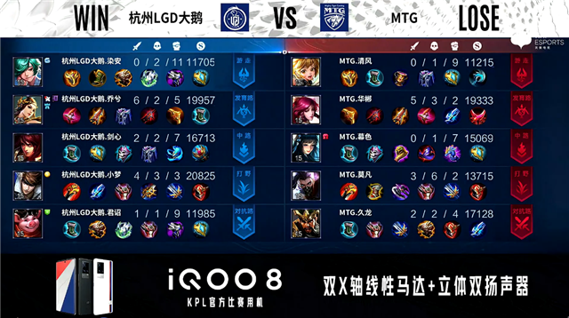双方常规开局。1分07秒杭州LGD大鹅拿下中路河道之灵。2分24秒发育路团战杭州LGD大鹅打出1换2。5分44秒杭州LGD大鹅对抗路击杀马超。7分26秒杭州LGD大鹅阿拿下庄周。7分38秒中路团战MTG击杀牛魔。9分50秒野区团战杭州LGD大鹅打出0换2。10分01秒杭州LGD大鹅摧毁敌方中路外塔。10分14秒杭州LGD大鹅拿下暗影暴君。10分44秒发育路团战MTG击杀牛魔。12分24秒杭州LGD大鹅拿下暗影主宰。13分23秒杭州LGD大鹅野区击杀盾山。13分32秒杭州LGD大鹅摧毁敌方中路高地塔。15分04秒杭州LGD大鹅对抗路击杀盾山。16分35秒杭州LGD大鹅拿下暗影主宰。18分15秒杭州LGD大鹅强点水晶拿下比赛。
