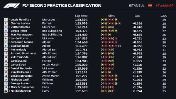在二练过程中,汉密尔顿依旧全场最快,勒克莱尔夹在了两台梅赛德斯中间,维斯塔潘似乎遇到了一点赛车调校的问题,当然二练最大的“玩笑”还是Kimi赛车的饮水系统漏水。