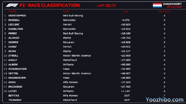 24直播网讯 2022年F1荷兰大奖赛正赛一波三折,最终红牛车队维斯塔潘在最后一次安全车结束后超越汉密尔顿,成功在主场拿到冠军!完成了在赞德沃特主场的两连冠。梅赛德斯车队拉塞尔收获亚军,法拉利车队勒克莱尔拿到季军!